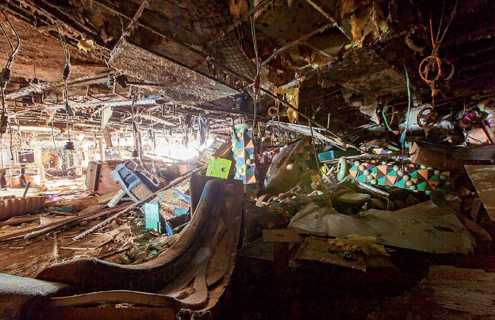 照片顯示,受海水的腐蝕,康科迪亞號的很多船艙已經難以辨認。樓梯間的屋頂散發出珊瑚般的綠色光芒,各種碎片垃圾遍布船內;娛樂室中曾經舒適的座椅如今只剩下金屬支架,舞台上的揚聲器和其他設備鏽跡斑斑;空蕩蕩的酒吧中依然還有成排的凳子,但都已經佈滿橙色鏽跡。